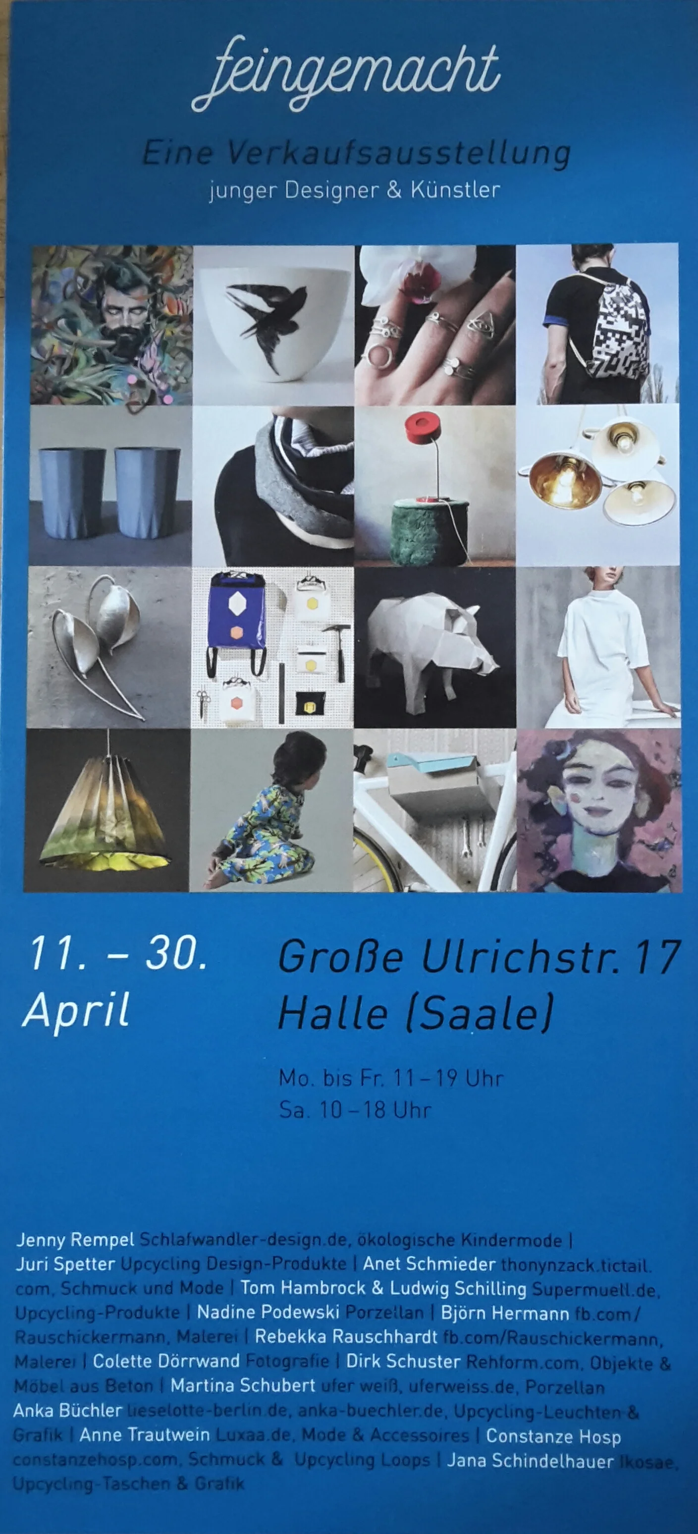 Am 11. April, ab 17 Uhr eröffnet die Ausstellung von 14 jungen Designern und Künstlern "feingemacht" im leerstehenden Ladengeschäft Große Ulrichstraße 17 in Halle Saale. Ausgewählte Designprodukte und Kunstwerke werden präsentiert und zum Kauf angeboten. Ich werde in der oberen Etage aktuelle Plastiken und Objekte zeigen.